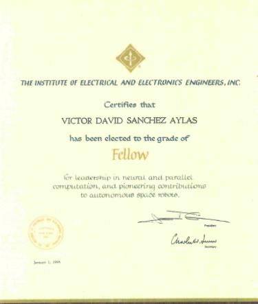 Prof. Dr. V. David Sánchez A., Ph.D., is a Fellow of the IEEE with the following citation: "For leadership in neural and parallel computation, and pioneering contributions to autonomous space robots". David is the youngest IEEEFellow in history worldwide. The IEEE Fellow is the world most prestigious award in Engineering, i.e., the "Nobel Prize" in Engineering.